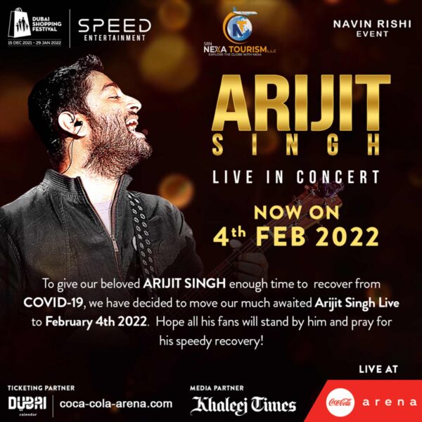 Due to health concerns and to allow time for Arijit Singh to recover from COVID-19, the highly anticipated concert has been rescheduled to 4th February 2022. We appreciate your patience and support during this time and hope all fans will continue sending love and well wishes for his speedy recovery. 💛